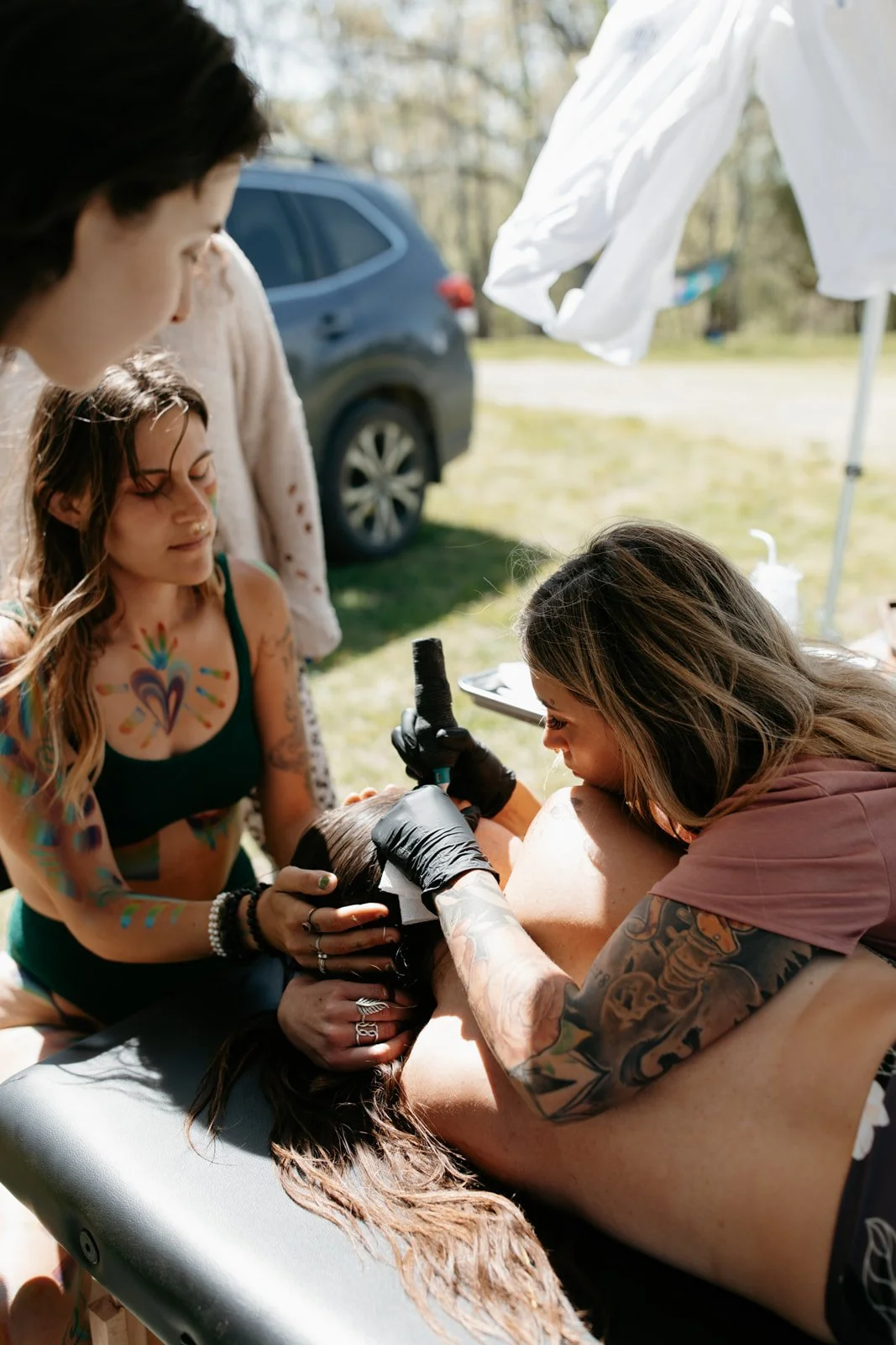 Having the sun and light breeze bless my session, incredible love surrounding me, my internal work and strength, all made my session. I worked deeply with my breathe, my sisters energy holding me, physically and spiritually, and healed deep parts of myself. It was one of the most beautiful tattoo sessions I have ever experienced. Each time it is available at a retreat, I will be booking this therapy. HIGHLY recommend.”